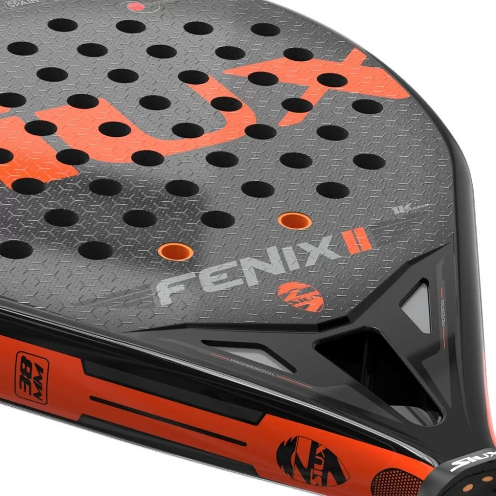 Questa Siux Fenix viene rifinita con vernice lucida con rifiniture rugose in 3D sulle facce della racchetta per poter imprimere maggior effetto ai colpi..